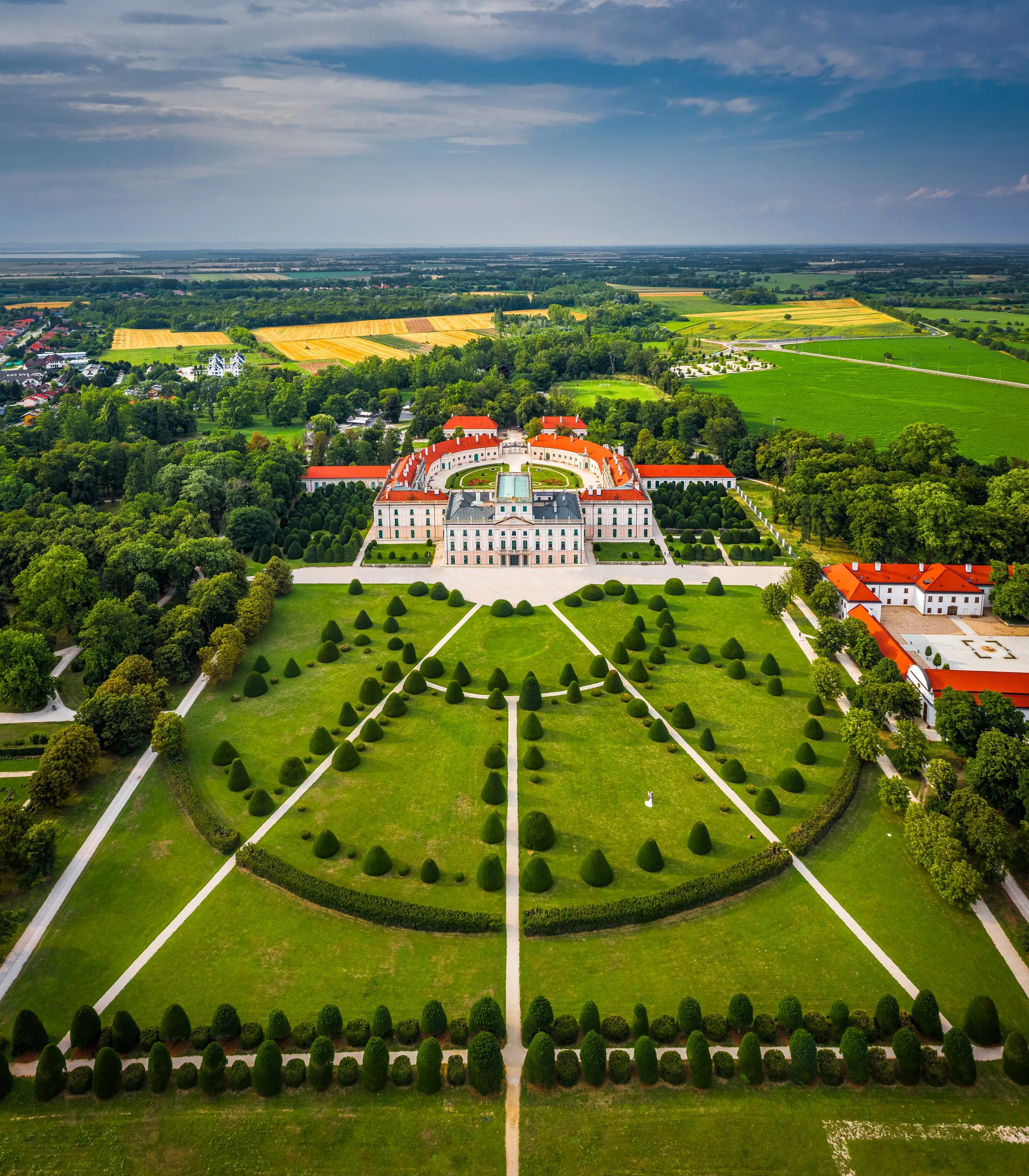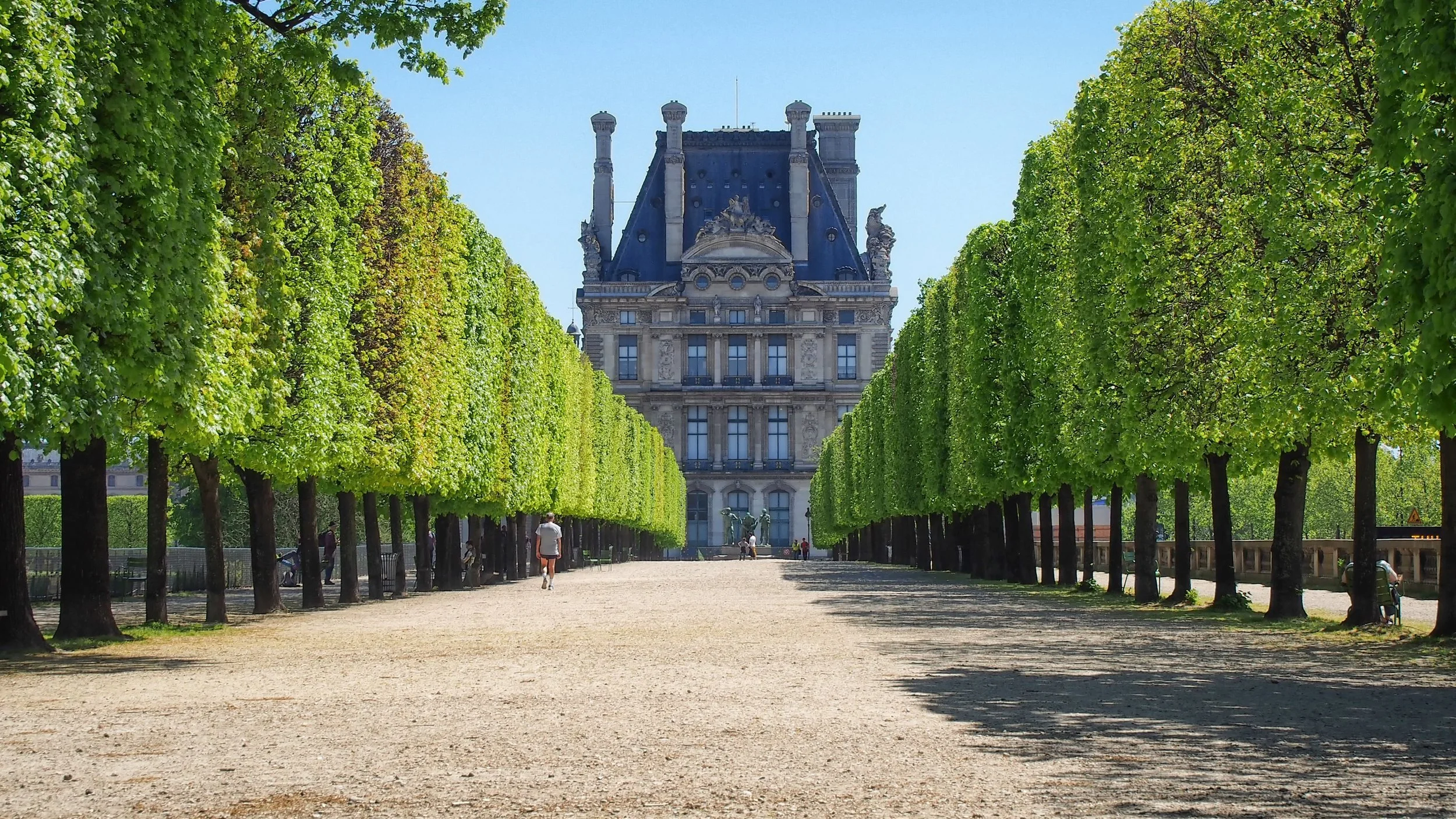The path and the row of trees make this landscape an interesting display that leads the ear to the sound of the fountain and the eye to the dwelling.